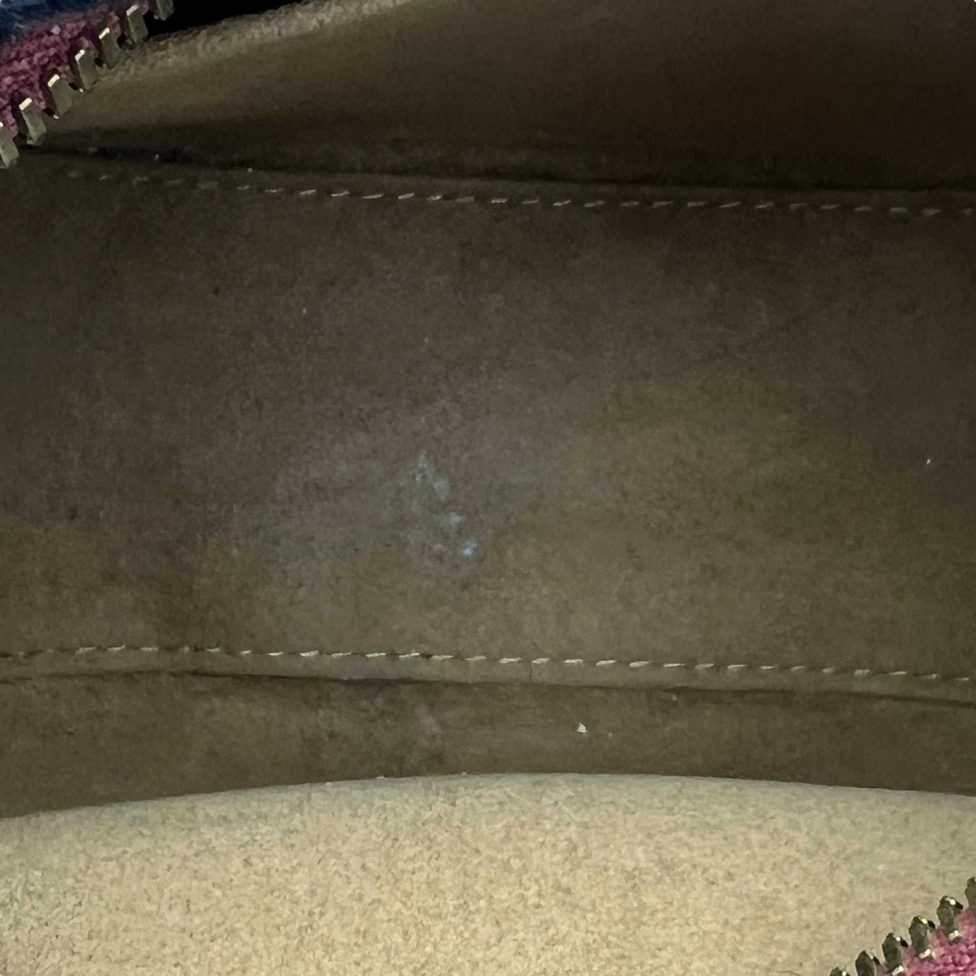 – Bottom Edge / Base / Bagfeet: Darkening at the base piping and light water mark